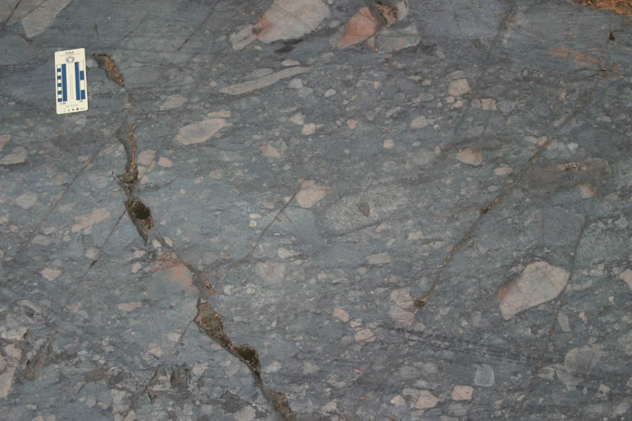 Fragmental dacite in pavement outcrop along road near south side of Deer Lake (see LaBerge). |