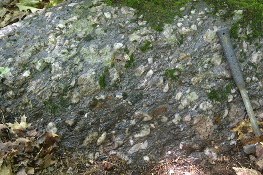Proterozoic Enchantment lake Formation basal quartz-pebble conglomerate near contact with Archean Mona schist - in woods to NE of roadcut. Other photos showing location of contact (not exposed) with this outcrop in view. |