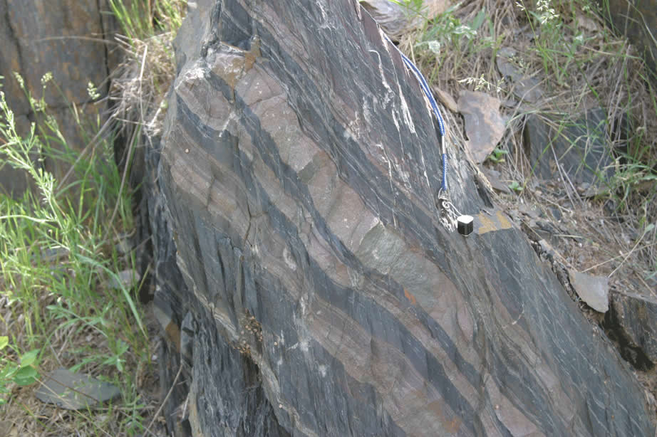 Siamo slate - lookiing ~east at OC - Bedding dips south ~ 60 degrees cleavage is steep to South. Close-up showing excellent bedding cleavage relationships - note also cleavage refraction. |
