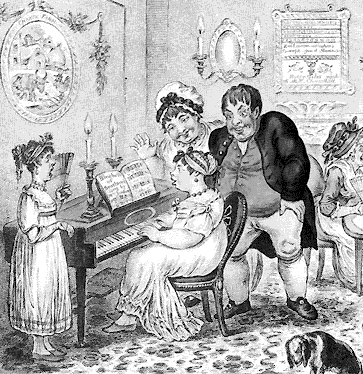 Satirical illustration depicting a farmer's daughter acquiring "accomplishments." [James Gillray] |