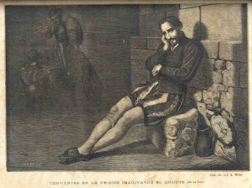 «Este que veys aqui, de rostro aguileño, de cabello castaño, frente lisa y desembaraçada, de alegres ojos y de nariz corba, aunque bien proporcionada, las barbas de plata, que no ha veynte años que fueron de oro, los vigotes grandes, la boca pequeña, los dientes ni menudos ni crecidos, porque no tiene sino seys, y essos mal acondicionados y peor puestos, porque no tienen correspondencia los vnos con los otros; el cuerpo entre dos estremos, ni grande, ni pequeño, la color uiua, antes blanca que morena, algo cargado de espaldas, y no muy ligero de pies; este digo que es el rostro del autor de La Galatea y de Don Quixote de la Mancha, y del que hizo el Viage del Parnaso, a imitacion del de Cesar Caporal Perusino, y otras obras que andan por ahi descarriadas y, quiza, sin el nombre de su dueño. Llamase comunmente Miguel de Ceruantes Saauedra.»
