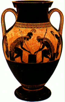 Amphora by the potter Exekias, depicting Achilles and Ajax playing morra. Attic black-figure vase, c. 530 BC. Etruscan Museum, the Vatican. |