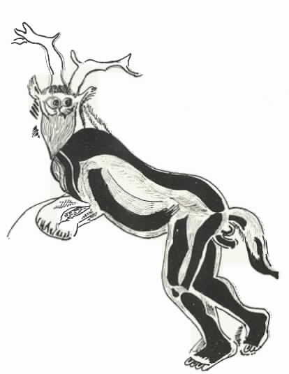 "The Sorcerer" from the cave of the Trois Frères (France, ca. 14,000 BC). Note the backwards phallus, the staring eyes, the antlers, and the "beard."