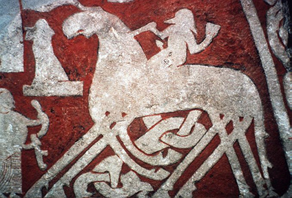 Odin on his eight-legged horse, Sleipnir. A valkyrie welcomes Odin back to Valhalla (note the cup of mead in his left hand). Detail of a picture-stone found at Tjängvide on the Swedish island of Gotland. Click on photo for a complete view. |