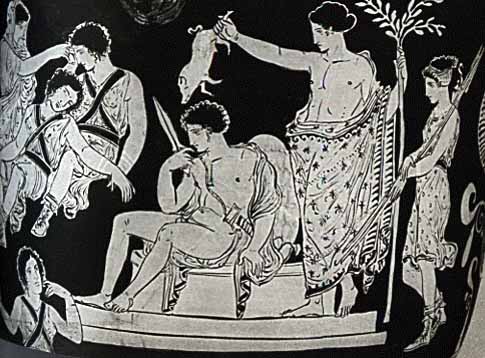 [Re-read "Apollo" (packet 13-14).] Eumenides = "the kindly ones." In the course of the play, the chorus of Furies turns into the kinder, gentler Eumenides. At the first production of the play, the Furies' costumes were reportedly so terrifying that they caused several members of the audience to faint. The vase painting at right depicts Orestes sitting in front of the omphalos stone at Delphi. He still holds the sword he used to kill Clytemnestra. Apollo purifies him of the blood-guilt (miasma) by dousing Orestes with the blood of a pig. The Furies lie sleeping at the left--at the far left you can just see Clytemnestra's ghost trying to wake them and rouse them to action. |