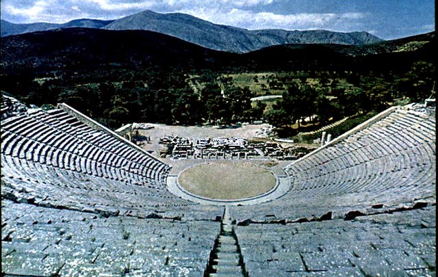 The presentation of the plays probably resembled modern opera more than what we think of as a "play." All of the choral parts were sung (to flute accompaniment) and some of the actors' answers to the chorus were sung as well. The play as a whole was composed in various verse meters. All actors were male and wore masks, which may have had some amplifying capabilities. A Greek chorus danced as well as sang. (The Greek word choros means "a dance in a ring.") No one knows exactly what sorts of steps the chorus performed as it sang. But choral songs in tragedy are often divided into three sections: strophe ("turning, circling"), antistrophe ("counter-turning, counter-circling") and epode ("after-song"). So perhaps the chorus would dance one way around the orchestra ("dancing-floor") while singing the strophe, turn another way during the antistrophe, and then stand still during the epode.