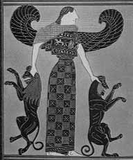 Here, Artemis tames the two lions (?) on either side of her. From the Francois vase, the Louvre. |